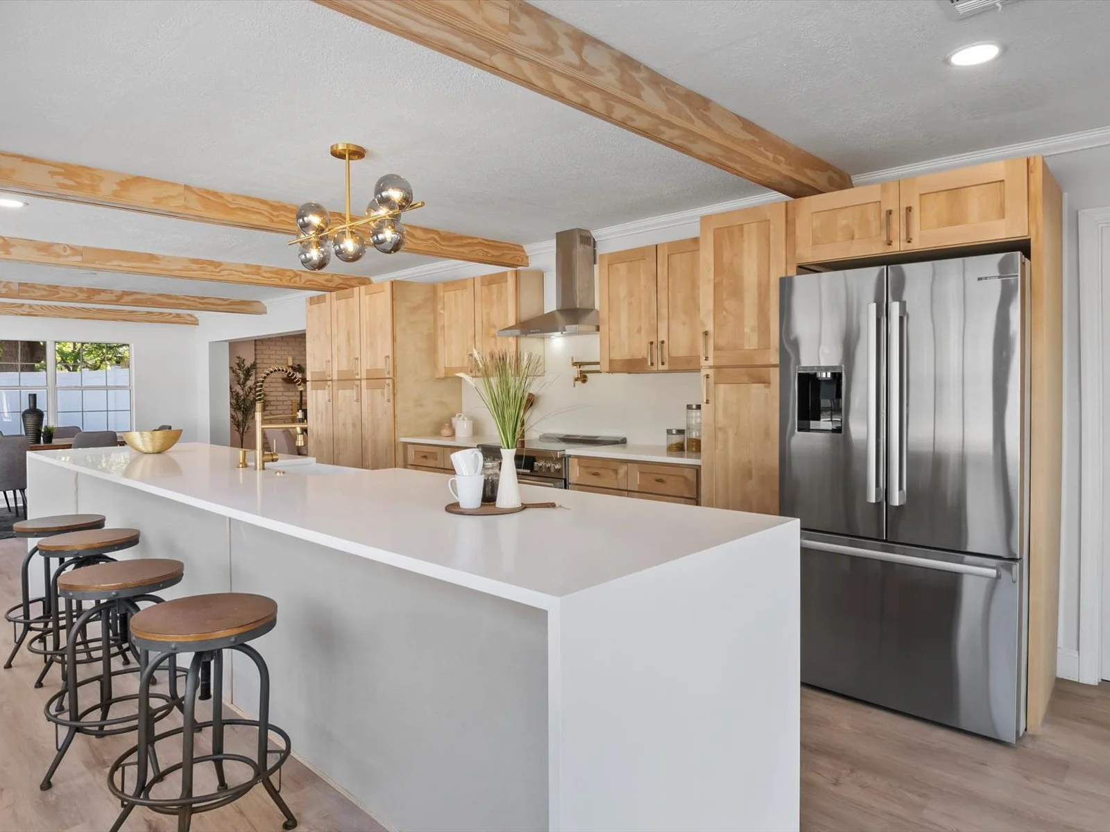 Light wood tones, brass accents, and bold beams create a space that feels grounded, bright, and full of personality.