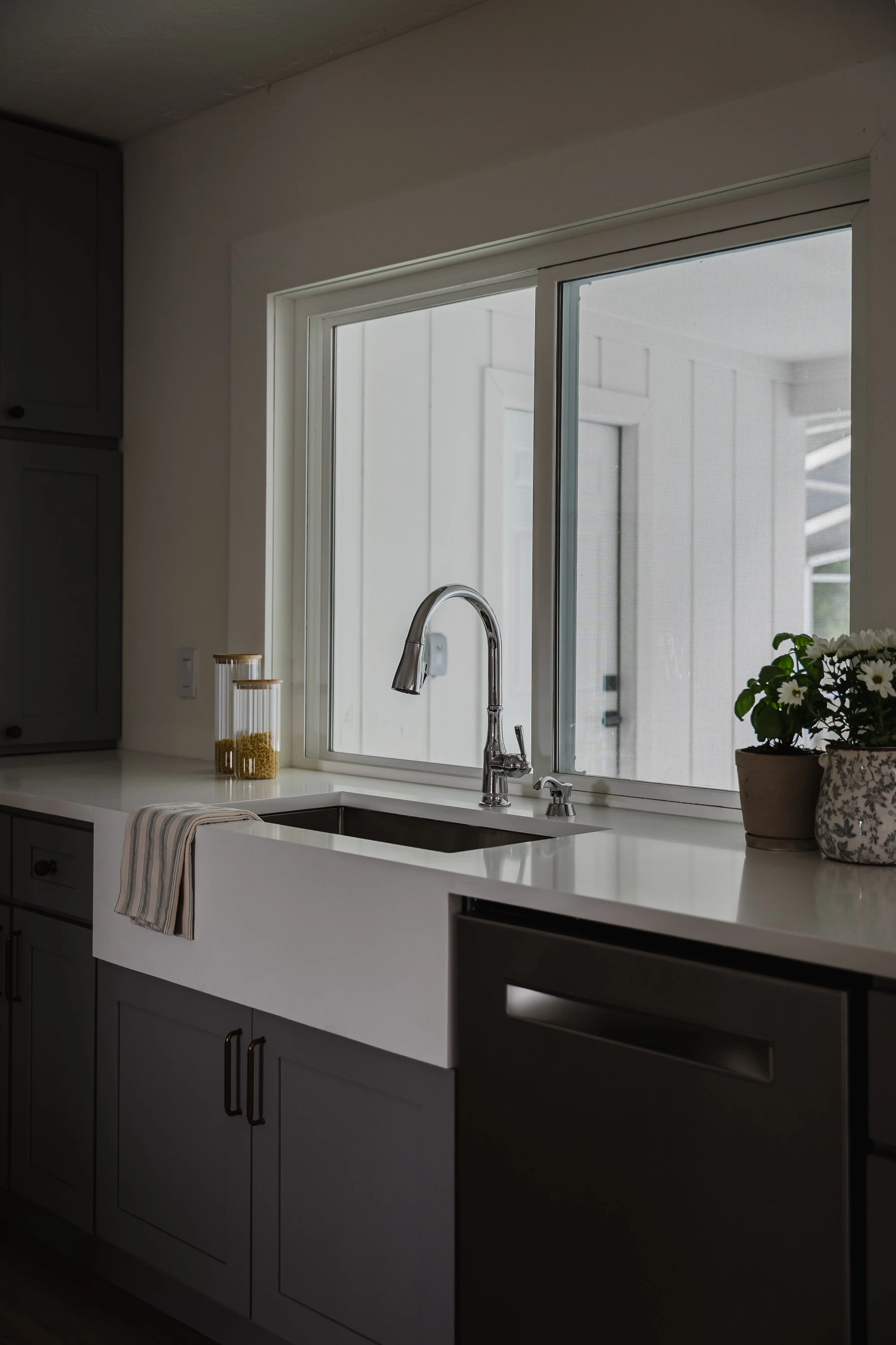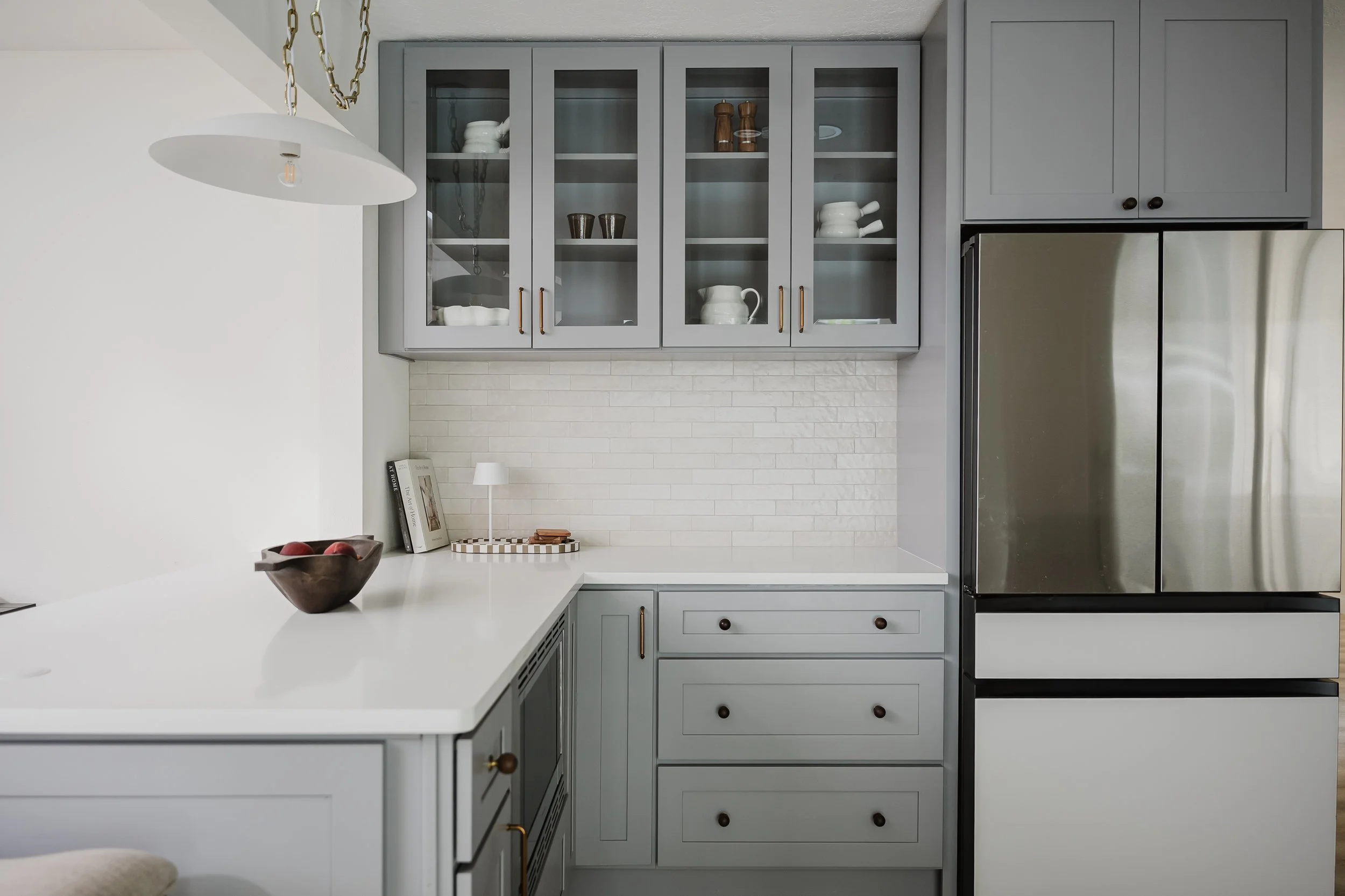 This kitchen blends modern elegance with a soft Parisian farm-luxe sensibility. Heather grey cabinetry and luminous quartz create a calm, tailored backdrop, while warm tile and natural wood floors add rustic depth and character. Delicate pendant lighting and sculptural wall sconces cast a golden glow around the clean-lined crafted hood, evoking the intimacy of a European café. Sunlight drifts through expansive glass doors, setting the scene for slow mornings, quiet conversations, and lingering cups of coffee