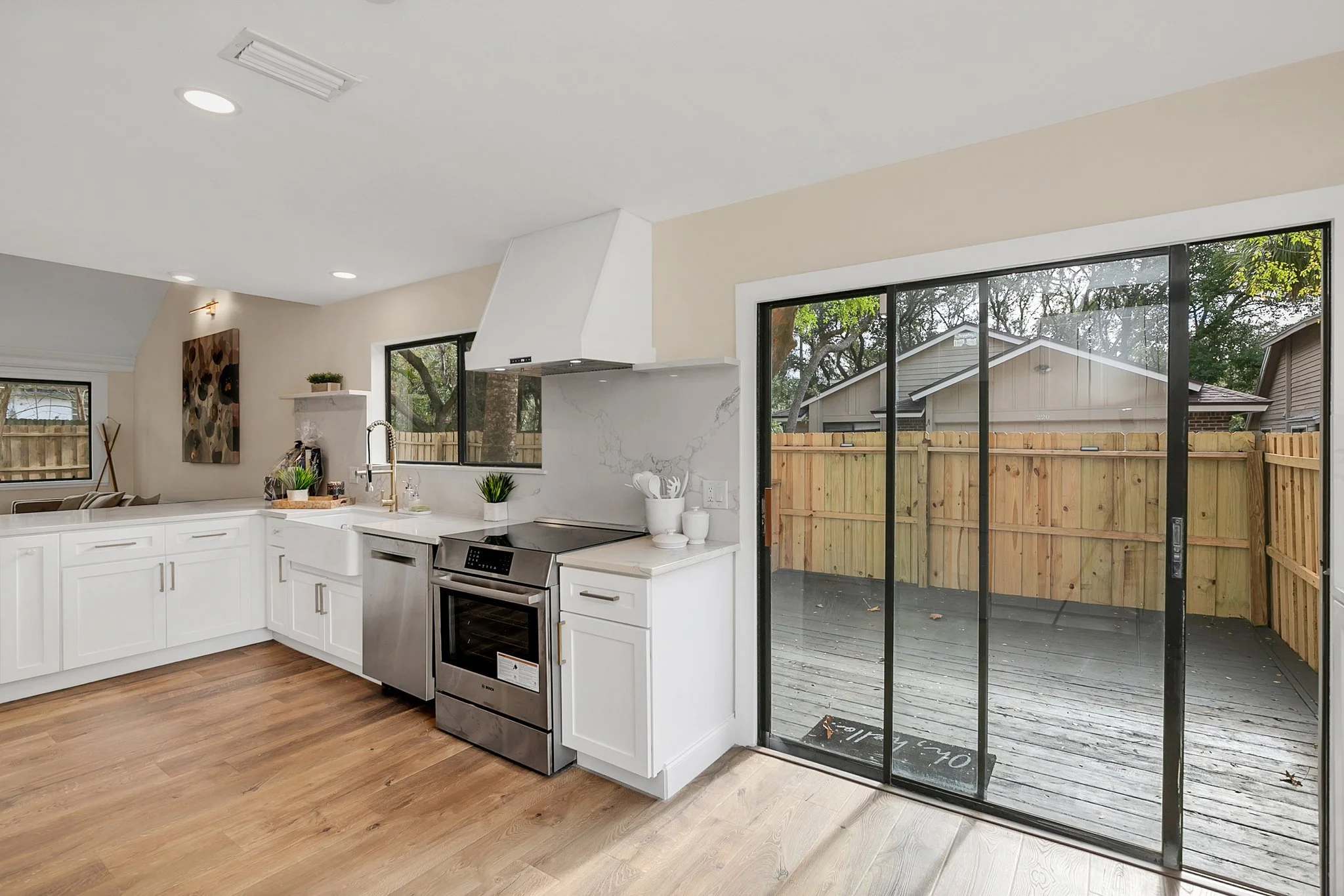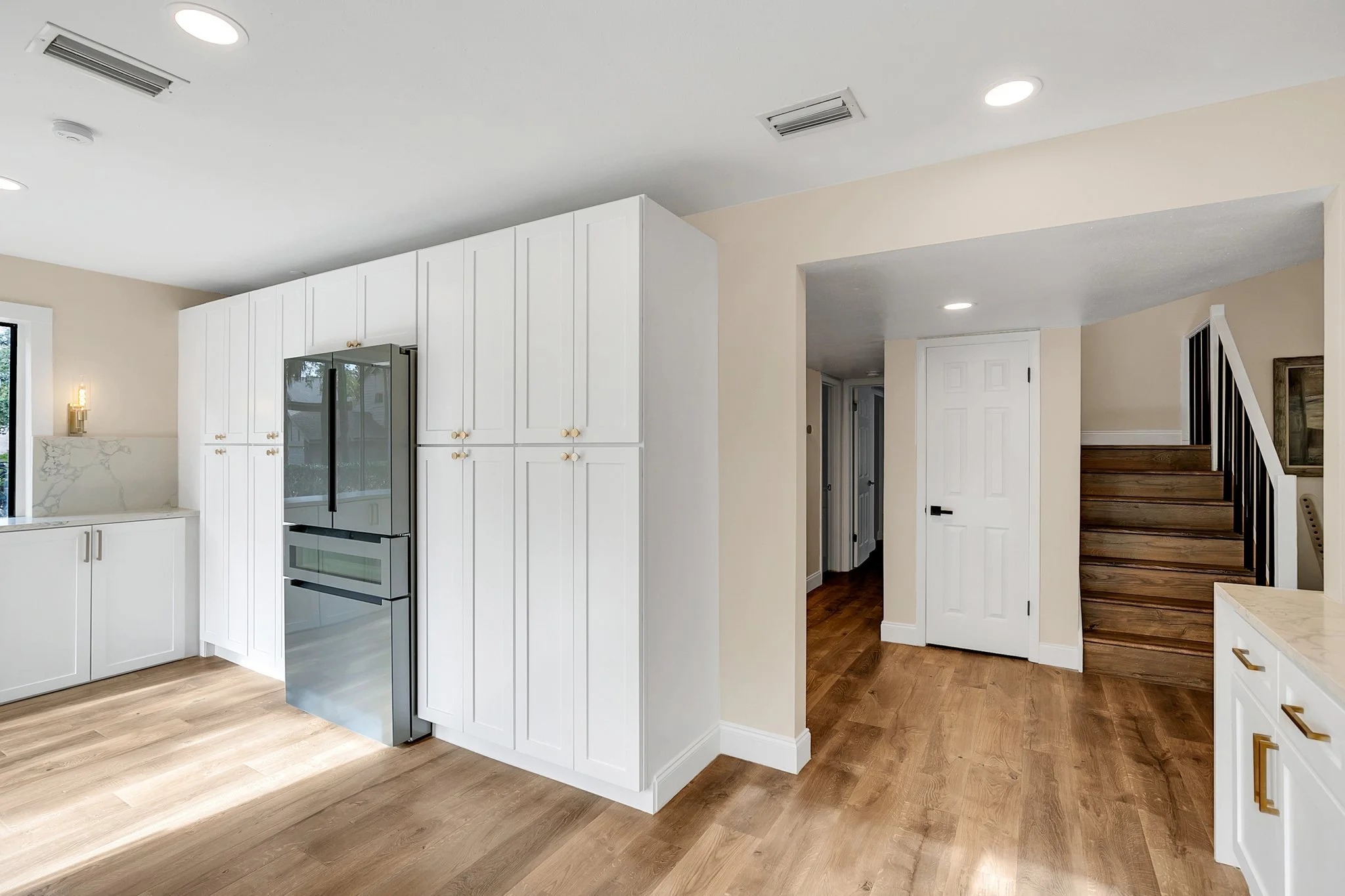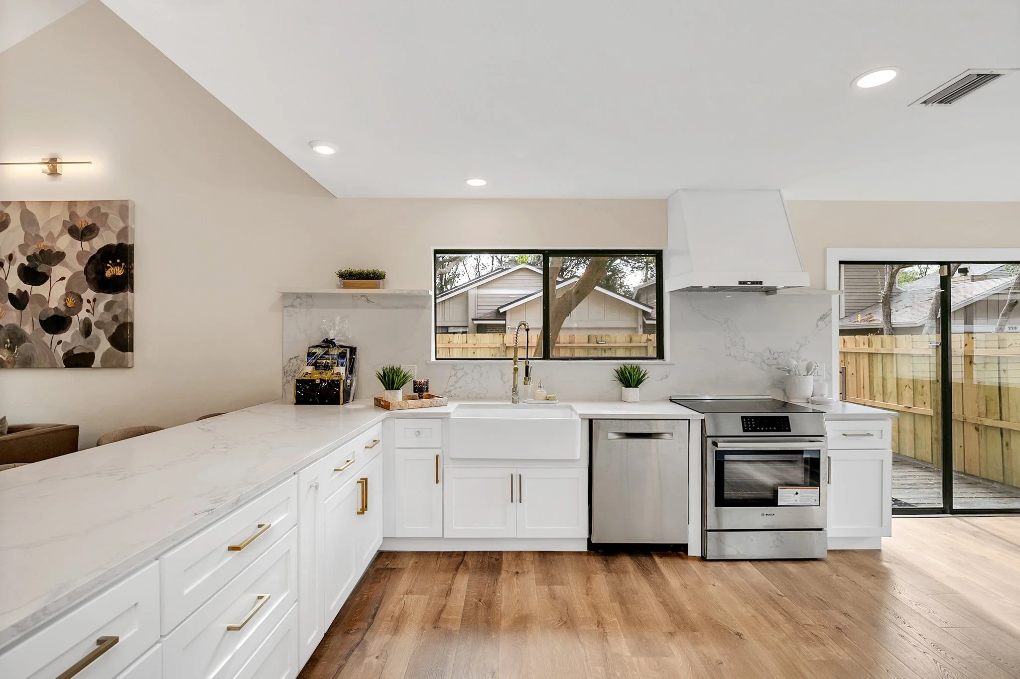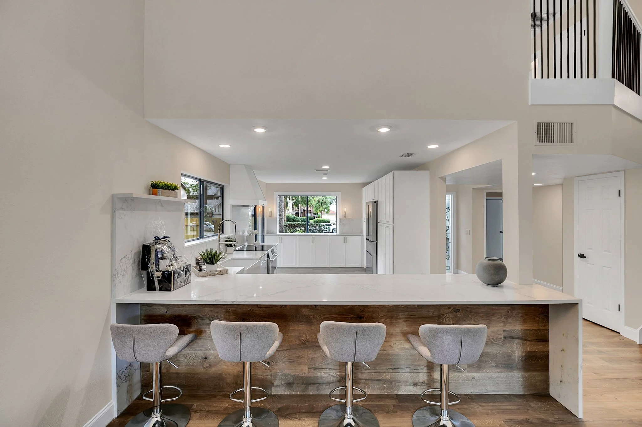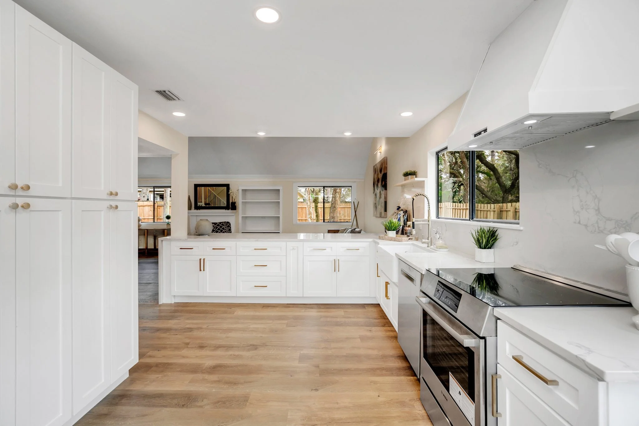 Contemporary kitchen with sleek finishes, Dove gray shaker style cabinetry, and a stylish fluted island. The open layout and neutral tones create a fresh, airy vibe.