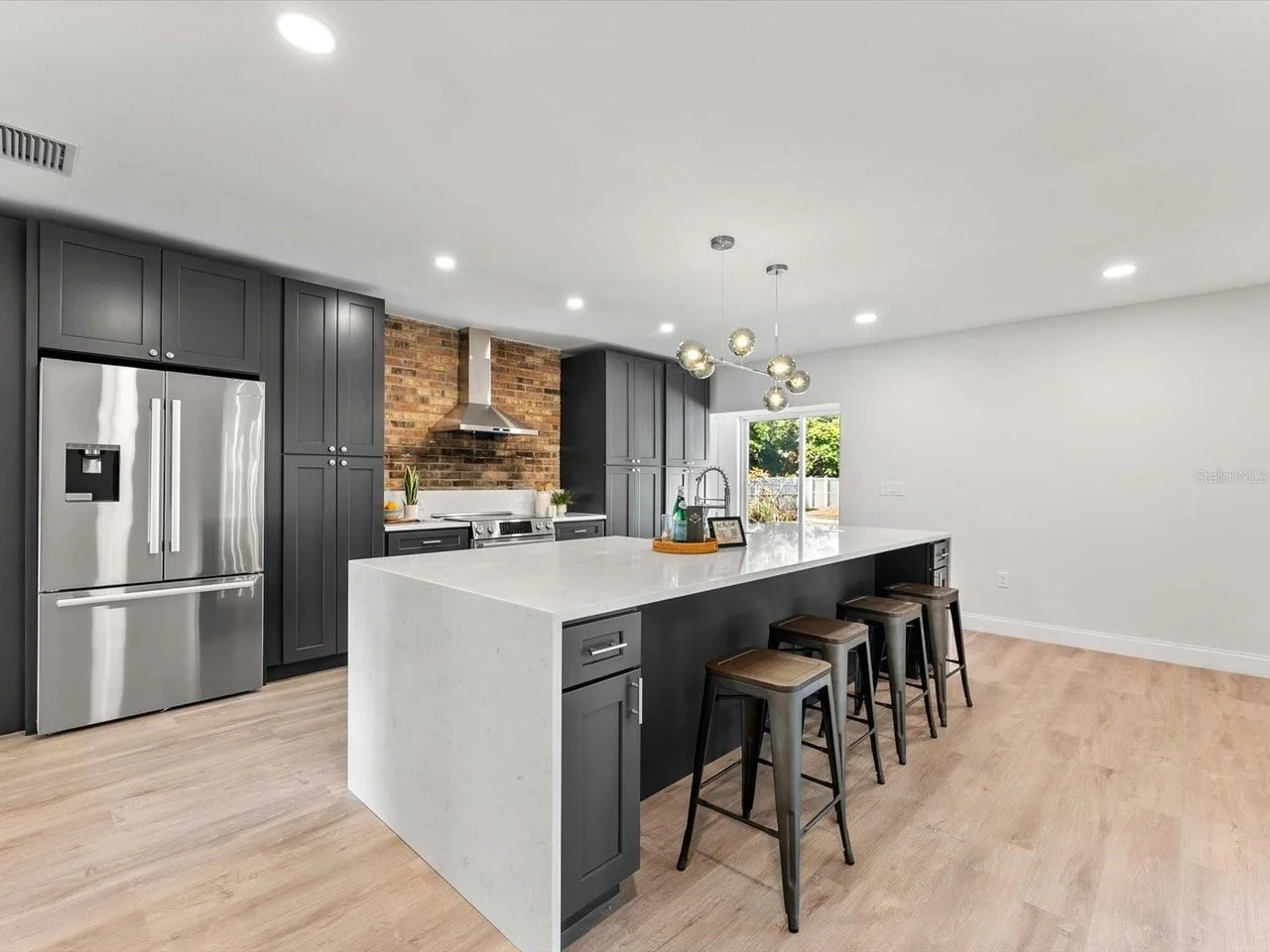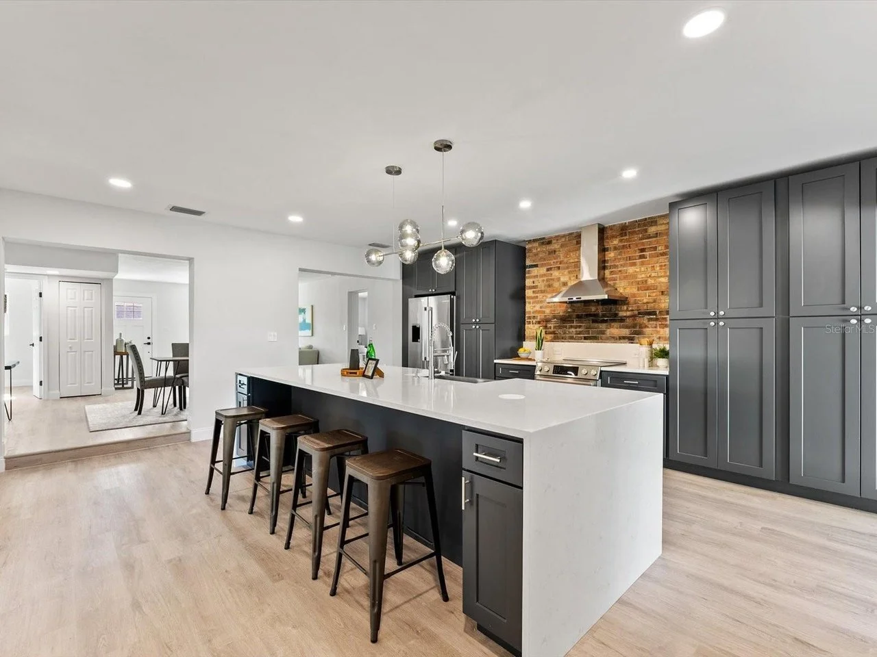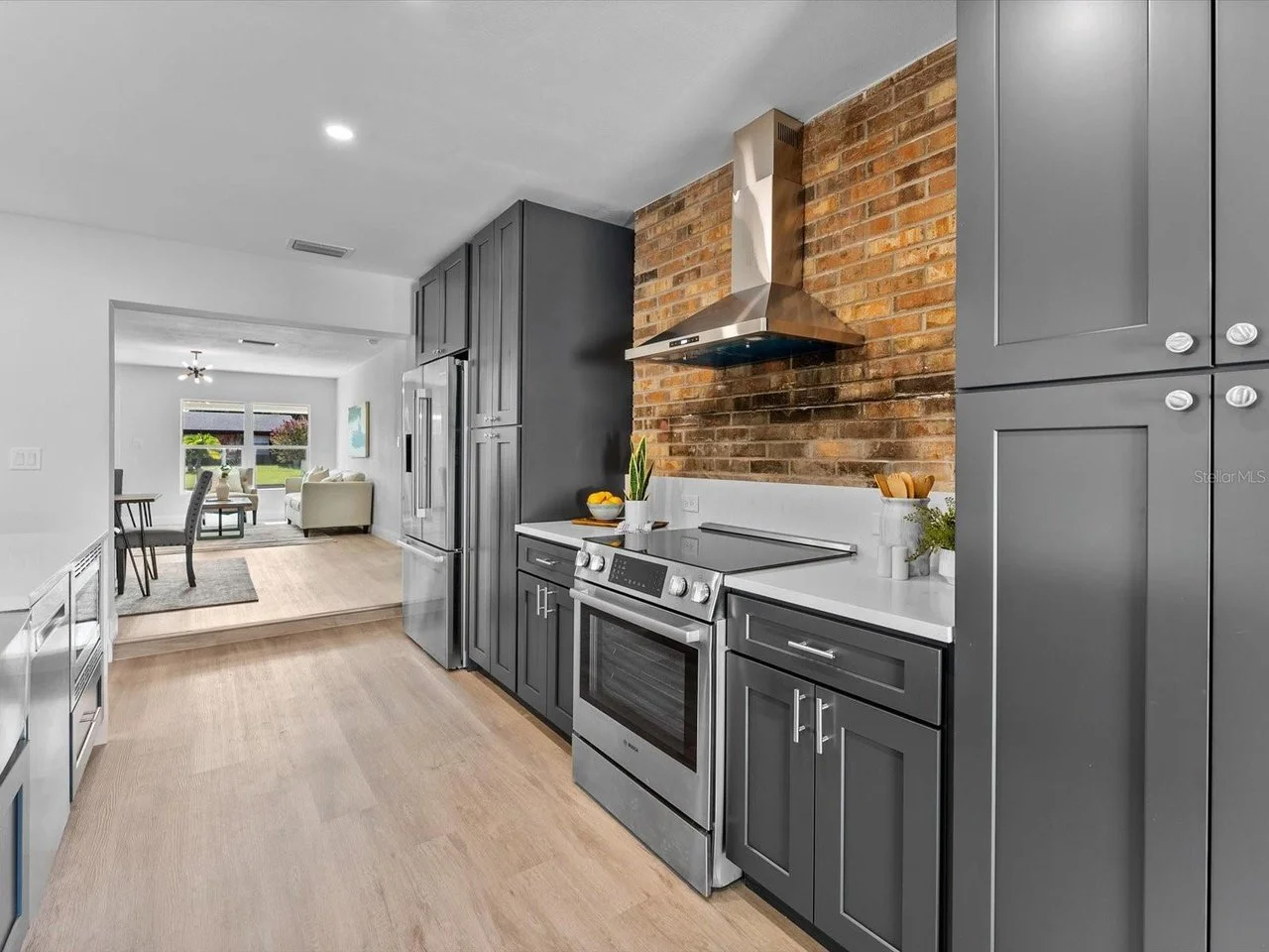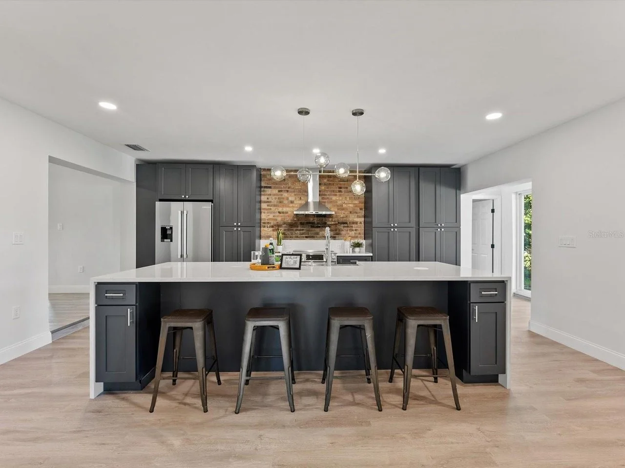 Transitional kitchen with a warm, industrial touch. Features charcoal shaker cabinets, white quartz countertops, and a striking exposed brick backsplash. The space feels stylish yet cozy with light wood floors and modern stainless steel appliances.