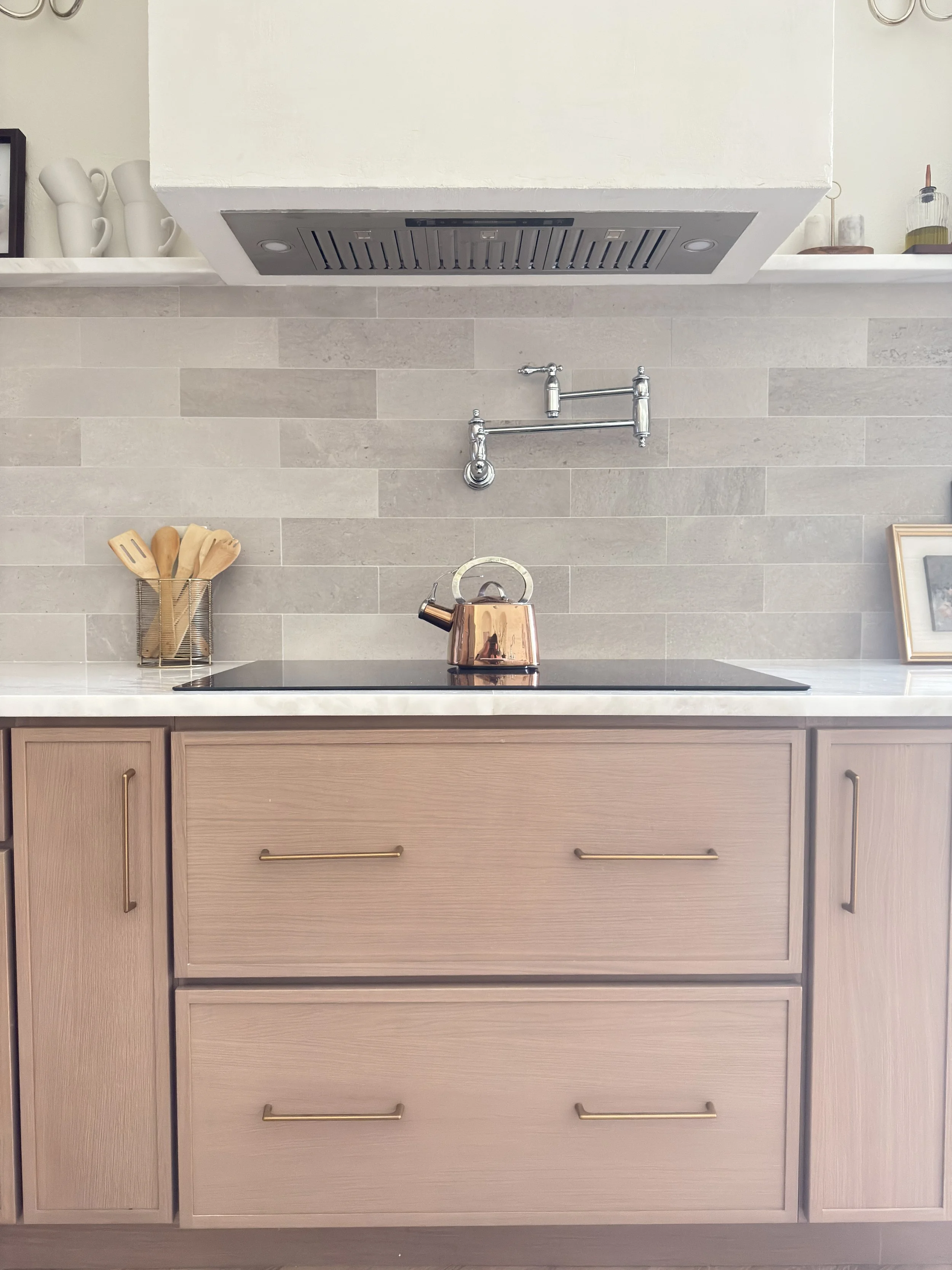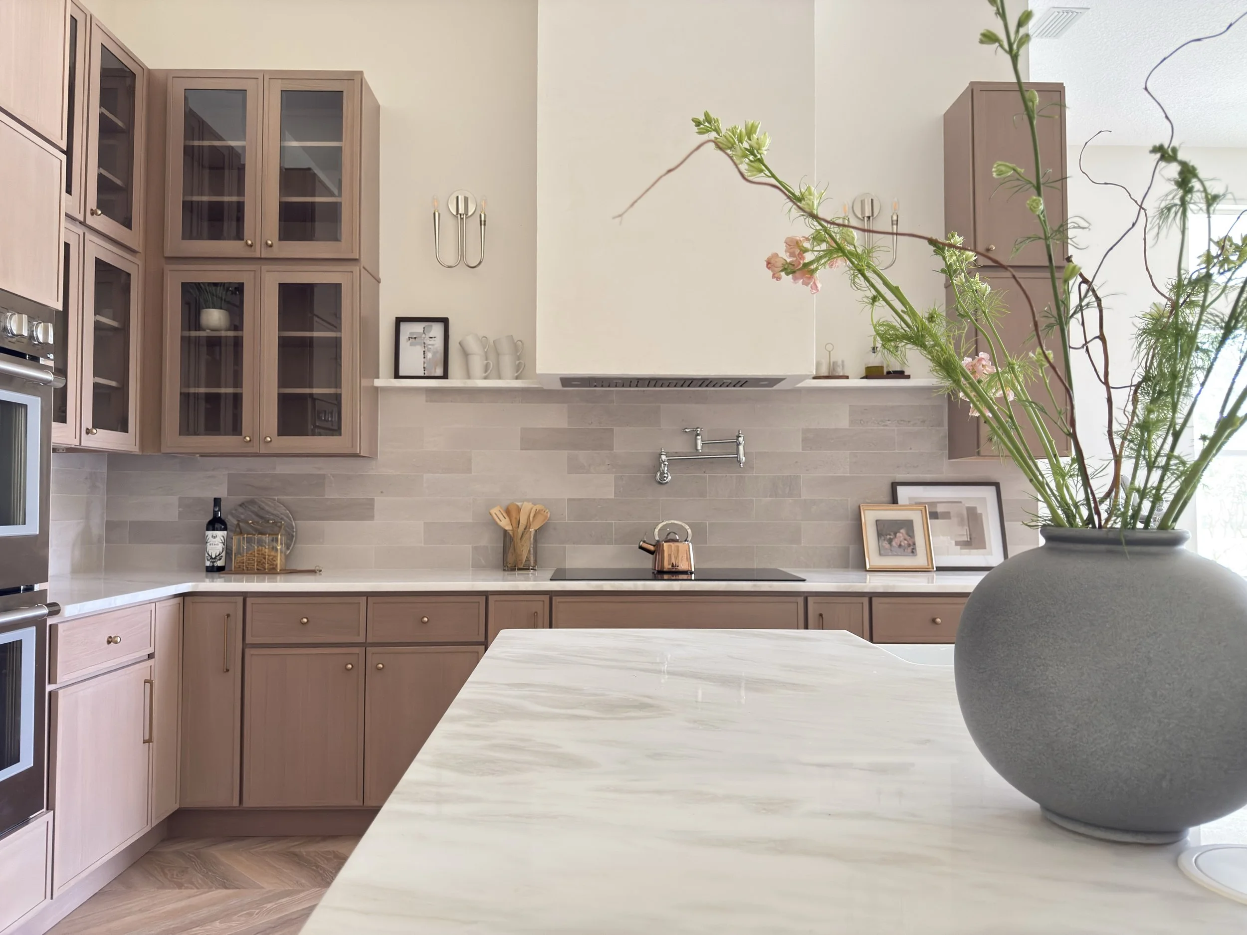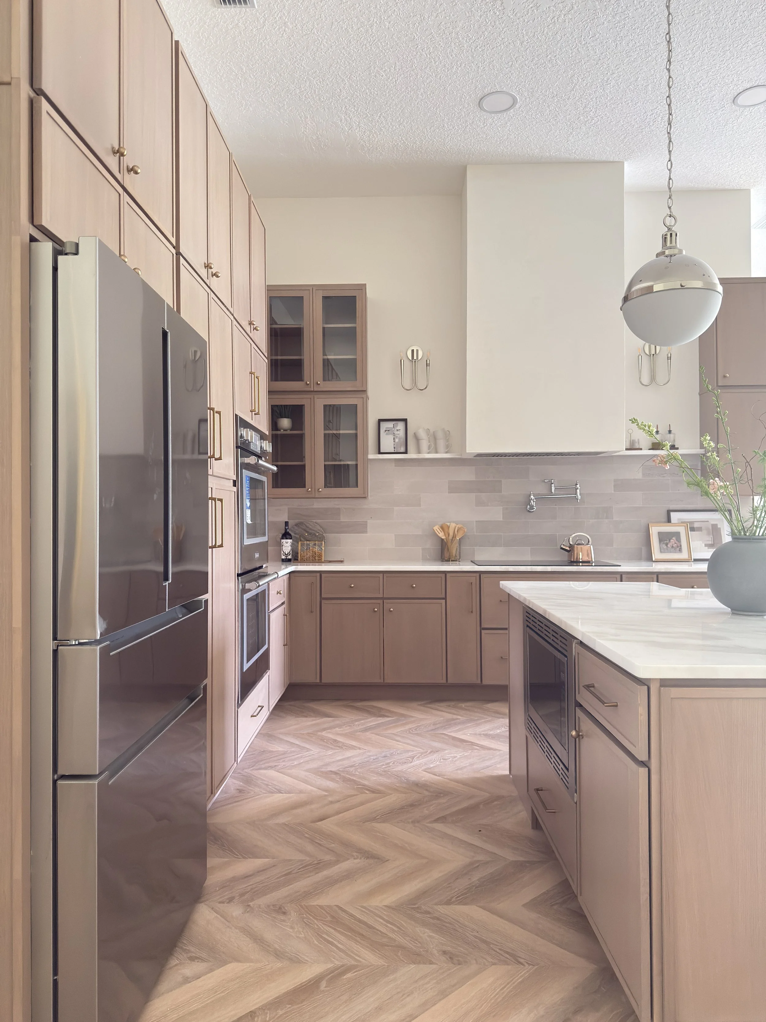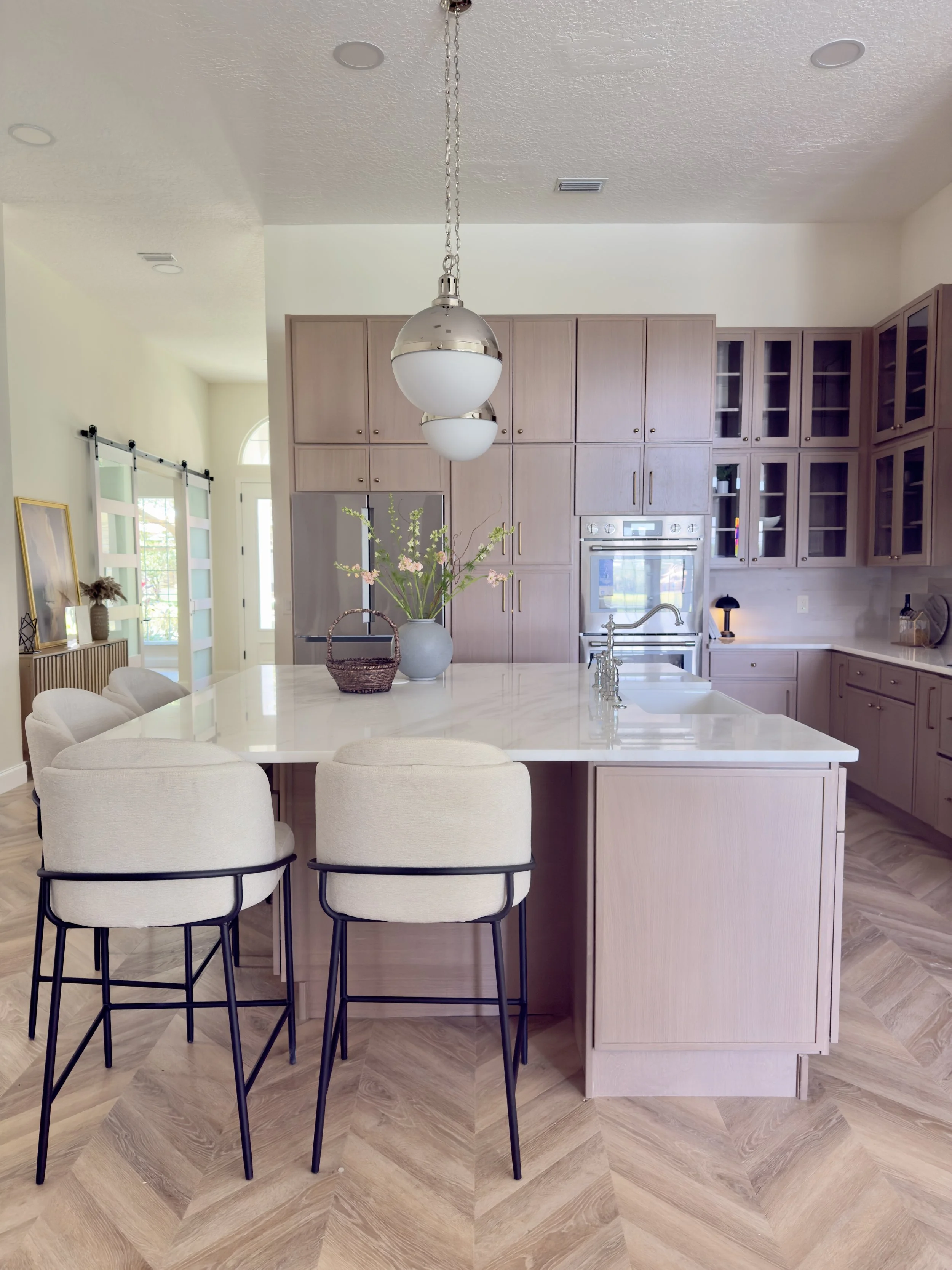 This kitchen captures the essence of warm modern design — clean lines, soft neutrals, and carefully chosen finishes that create a calm, inviting atmosphere. From the sleek white oak cabinetry to the elegant dolomite countertops and statement lighting, every detail was selected to bring style, function, and timeless appeal to the heart of the home.