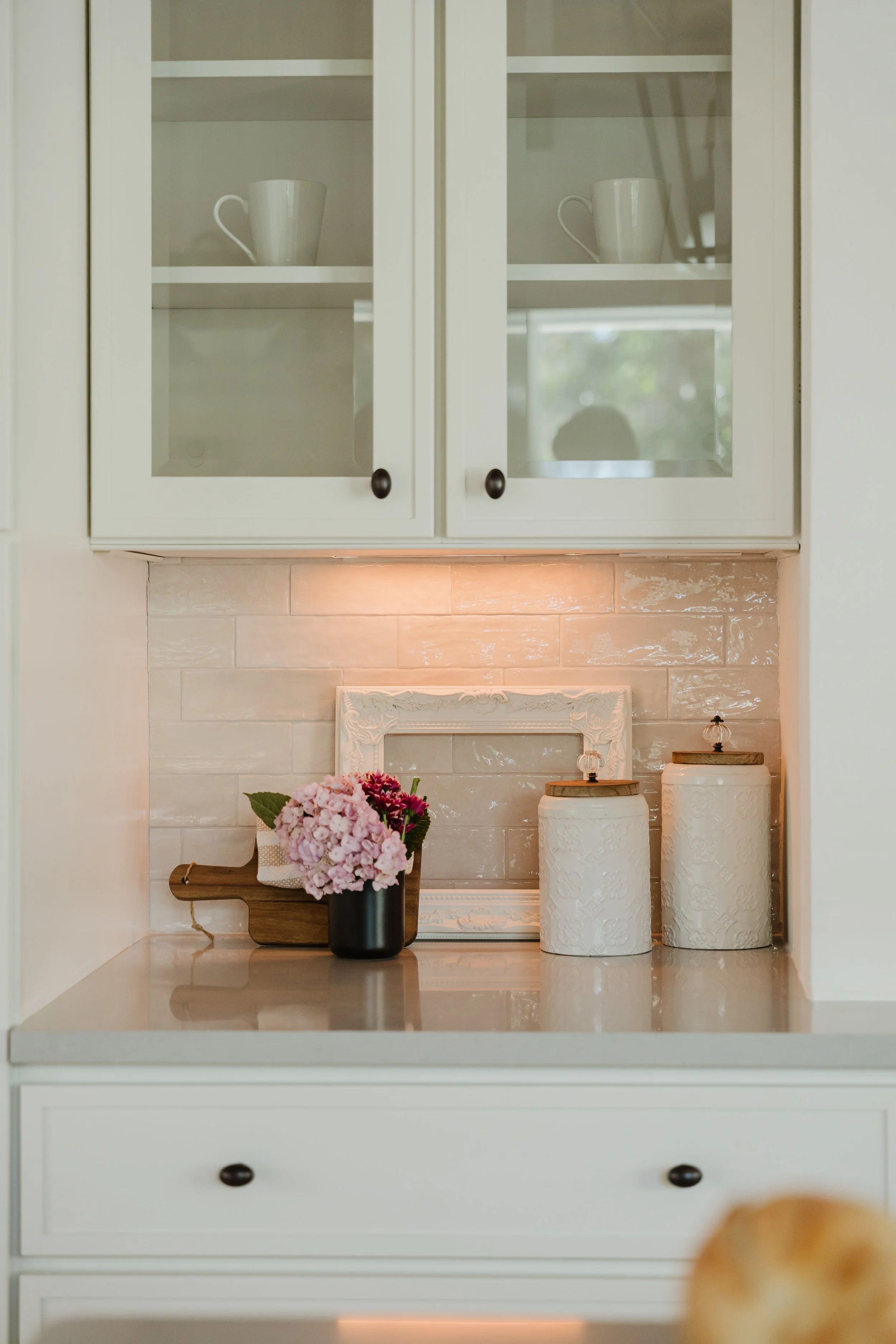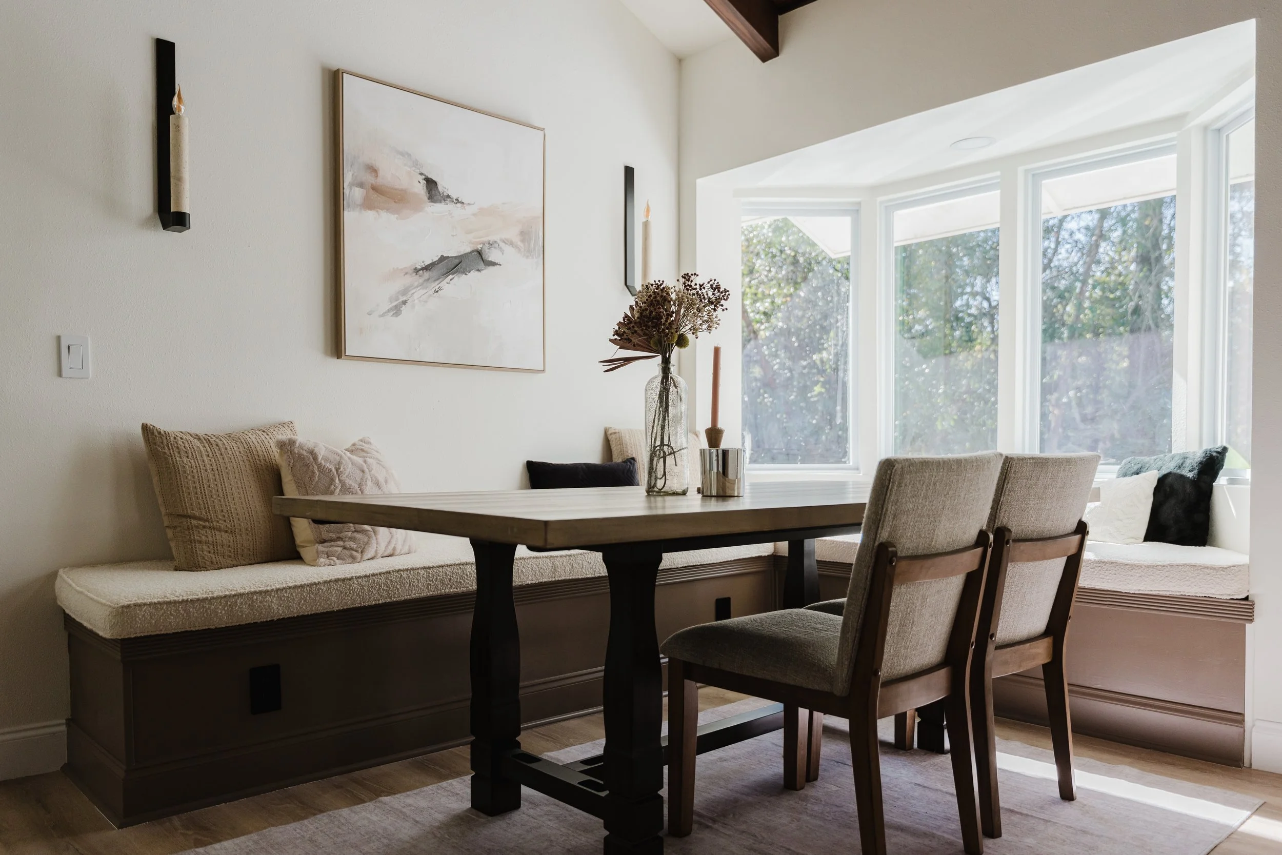This kitchen is a study in quiet luxury, where soft plaster, warm wood, and refined stone come together effortlessly. A sculptural venetian plaster hood creates a romantic focal point, complemented by Mist Grey quartz countertops that glow with understated elegance. The dark-stained wood ceiling wraps the space in warmth, while oversized pendants cast a gentle, intimate light. A modern stone sink adds an organic finish, grounding the design in timeless sophistication. A custom-crafted breakfast nook, designed to seat up to eight, is softly illuminated by candle-style sconces, inviting lingering mornings and effortless gatherings.